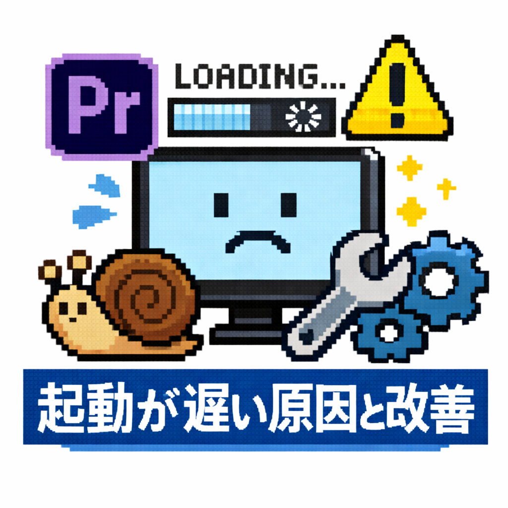 Premiere Proの起動が30秒以上かかる原因(前回プロジェクトの自動読み込み・プラグイン・メディアキャッシュ・SSD速度)と、設定変更で起動を速くする手順を解説。