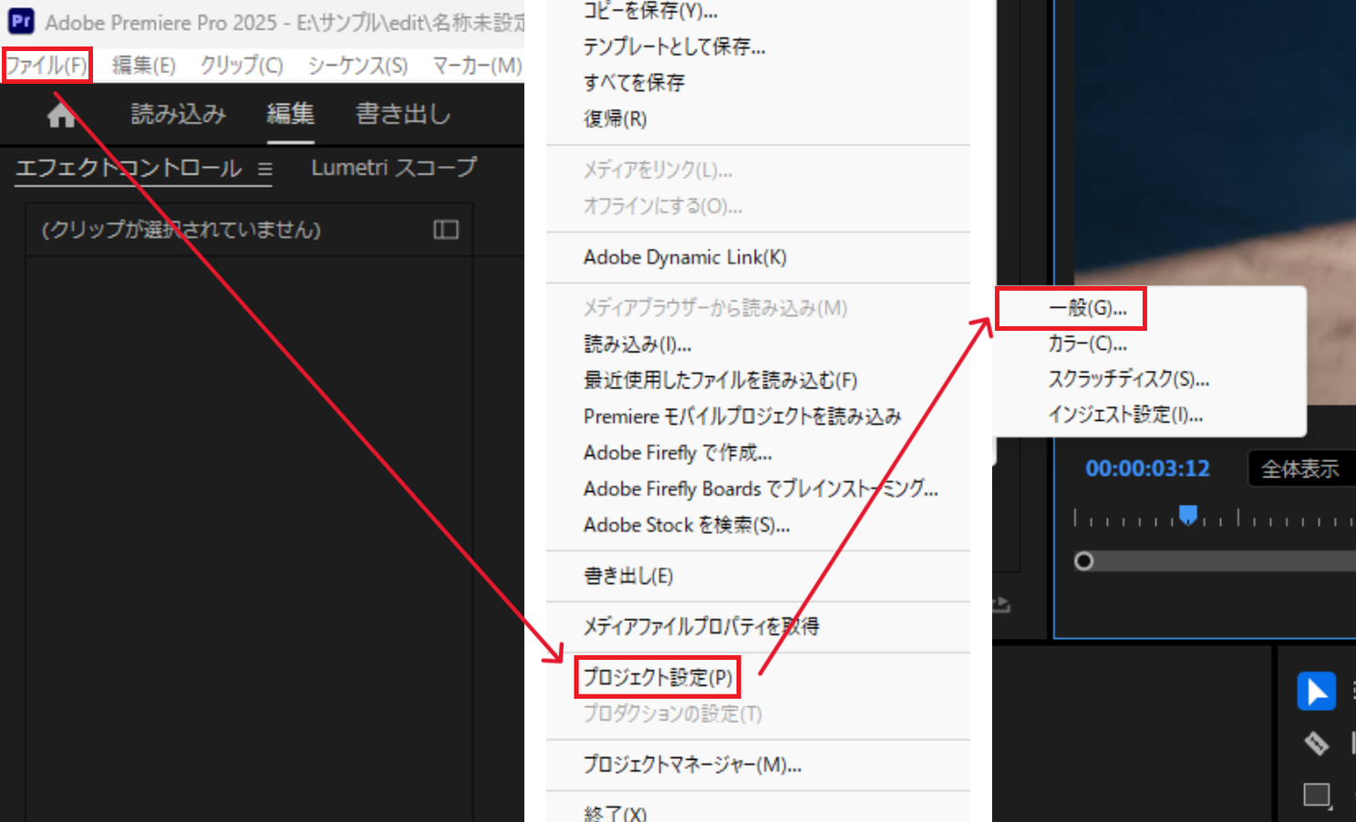 Premiere Proを起動し、「ファイル」→「プロジェクト設定」→「一般」を開く