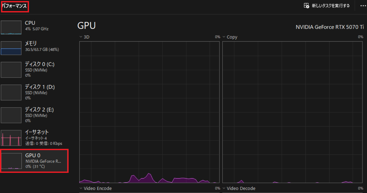 タスクマネージャー(Ctrl+Shift+Esc)→ パフォーマンス → GPU を開くと現在のGPU使用状況が確認できる。