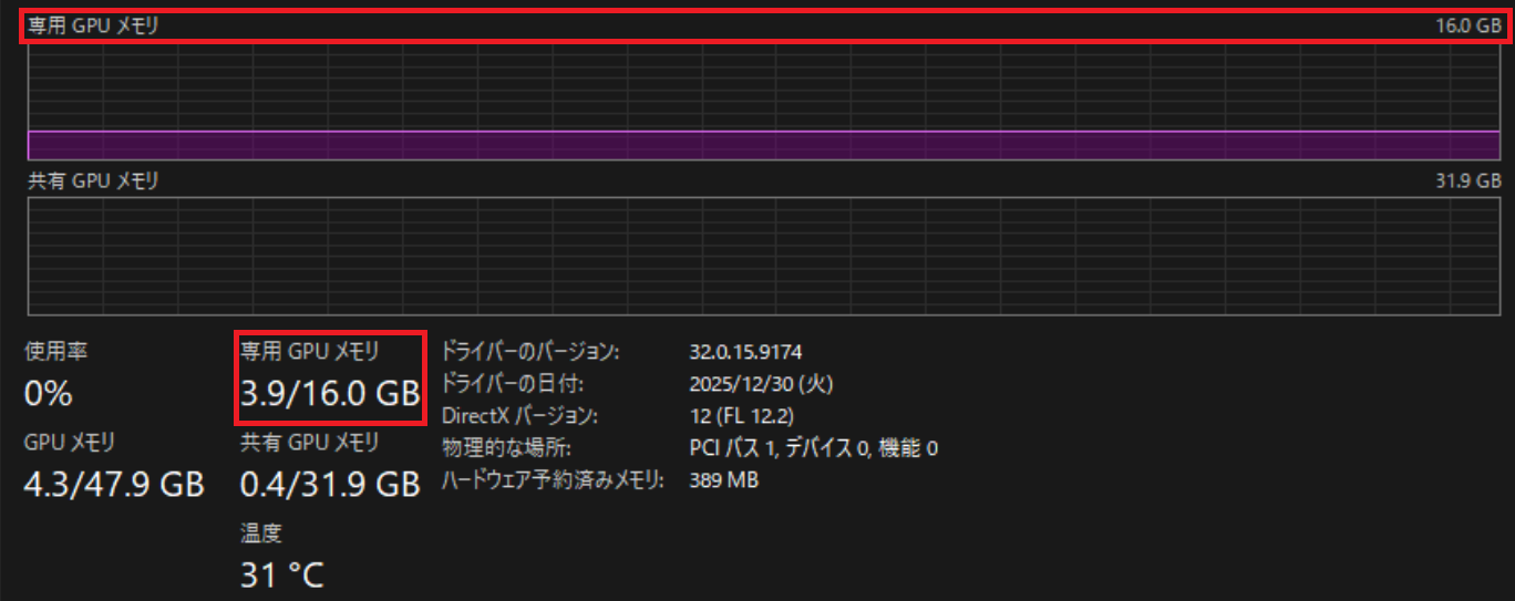 GPU画面の下部に表示される「専用GPUメモリ」の数値がVRAM使用量と最大容量を示す。使用量が最大値に近い場合はVRAM不足が疑われる。