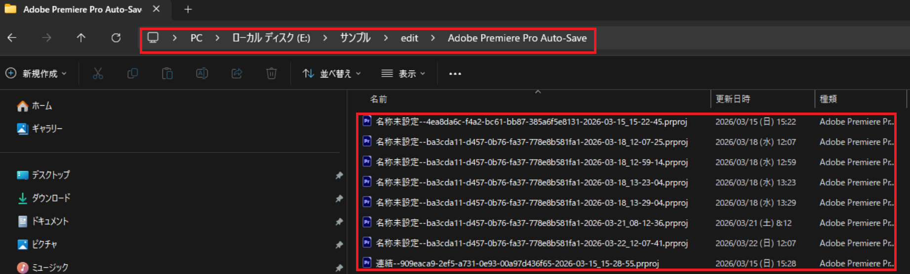 .prprojファイルを日時の新しい順に確認し、最新のものをダブルクリックしてPremiere Proで開きます。 - Windows:
