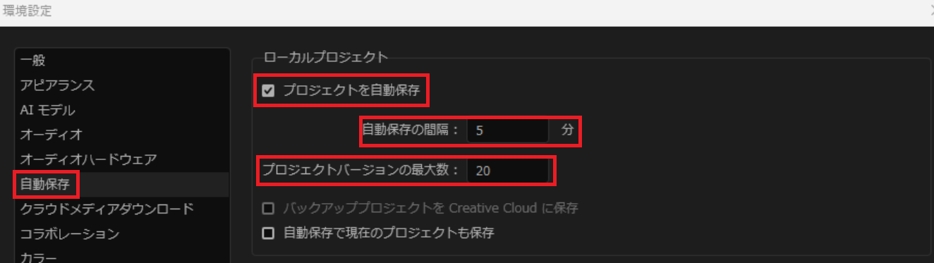 「プロジェクトを自動保存」にチェックが入っているかを確認し、保存間隔(推奨: 5分)とプロジェクトバージョンの最大数(推奨: 20以上)を設定する。