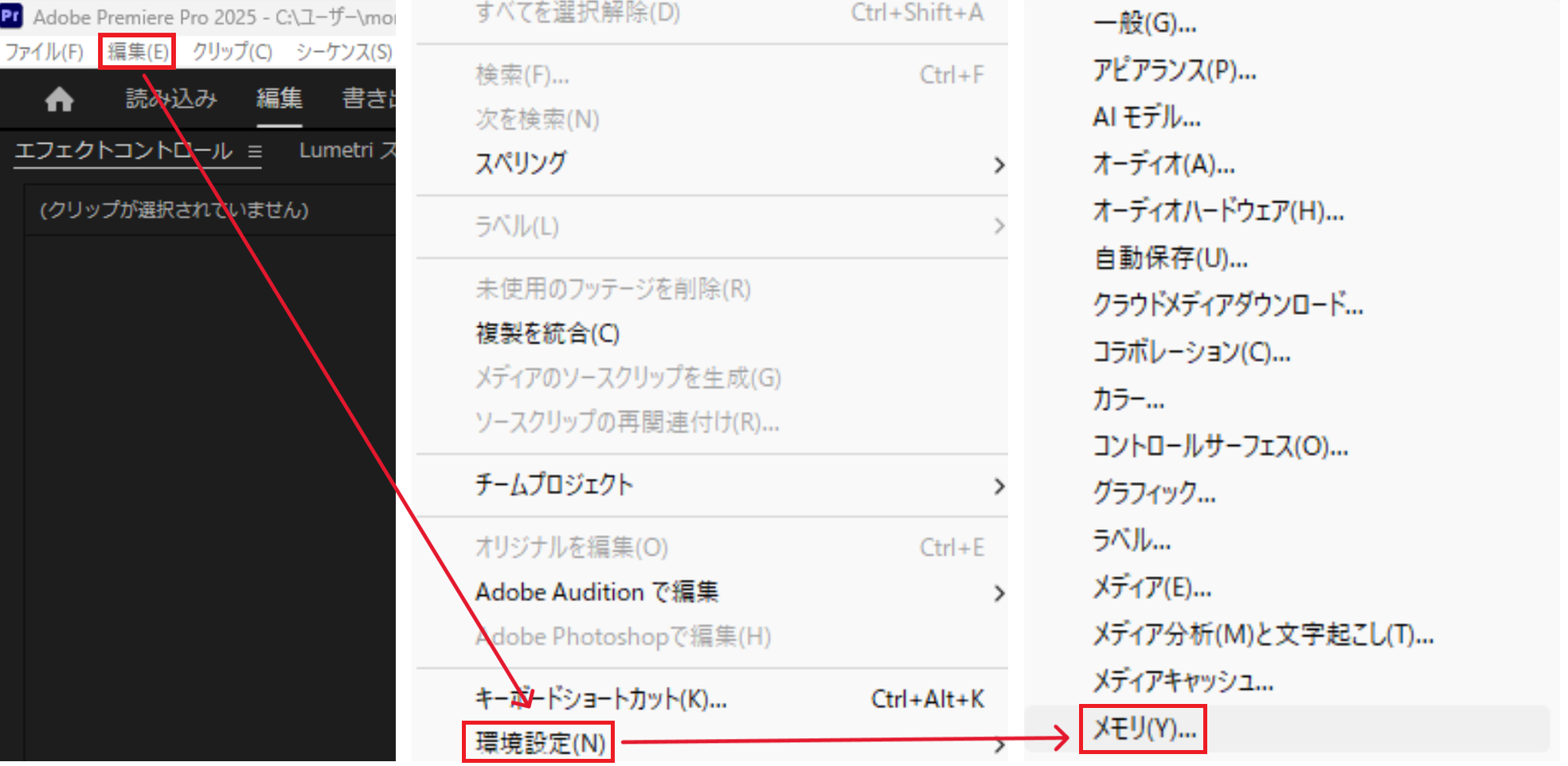 Premiere Proのメモリ設定を調整する — 編集 → 環境設定 → メモリ を開く。