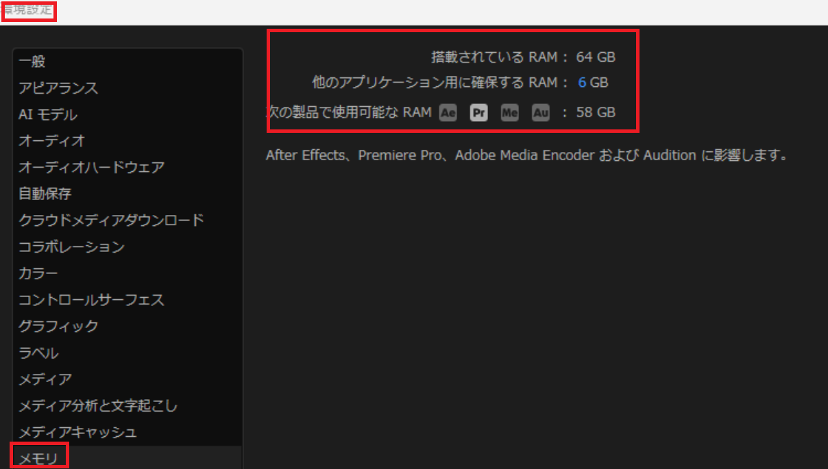 「他のアプリケーション用に確保するRAM」の推奨値はPC全体のRAM量によって異なる。RAM 16GBなら4GB、32GBなら6〜8GB、64GB以上なら8〜12GBを目安にする。Premiere Proに割り当てるRAMが多すぎると他のアプリが圧迫され、少なすぎると応答なしが再発しやすくなる。