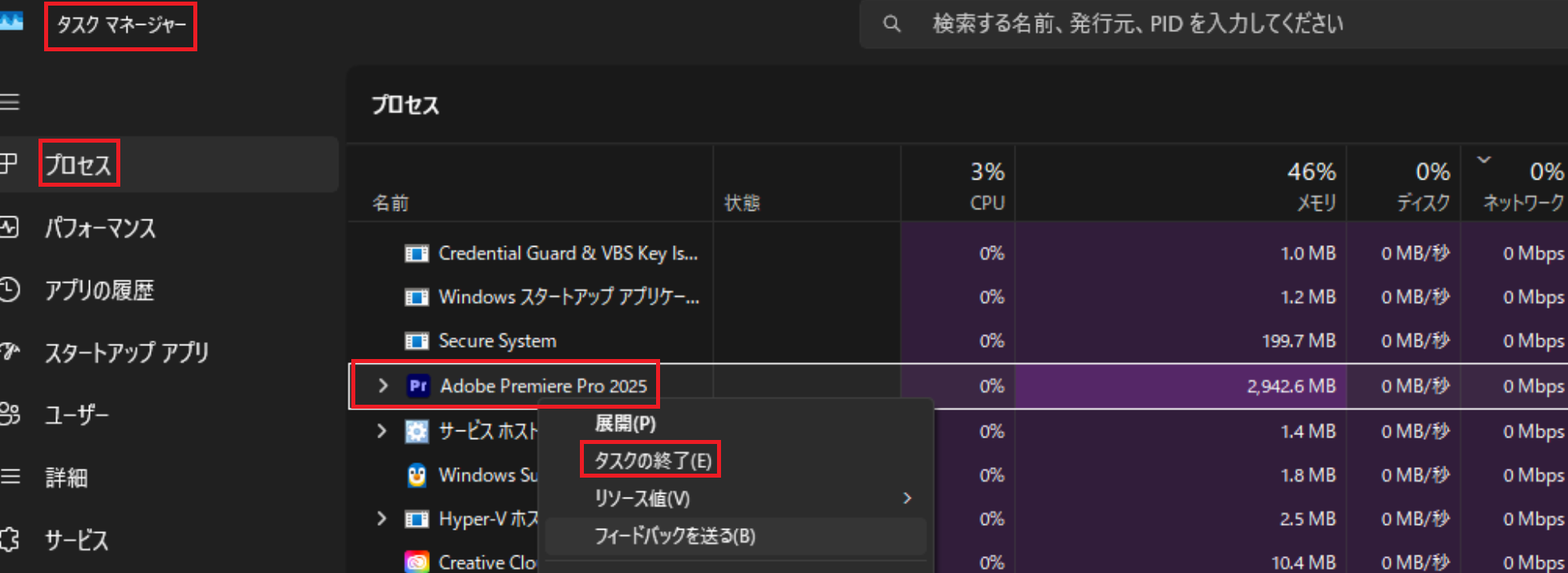 回復しない場合は強制終了する — 10分以上待機しても状態が変わらない場合は、タスクマネージャーでAdobe Premiere Proを右クリック → タスクの終了 を選択します。