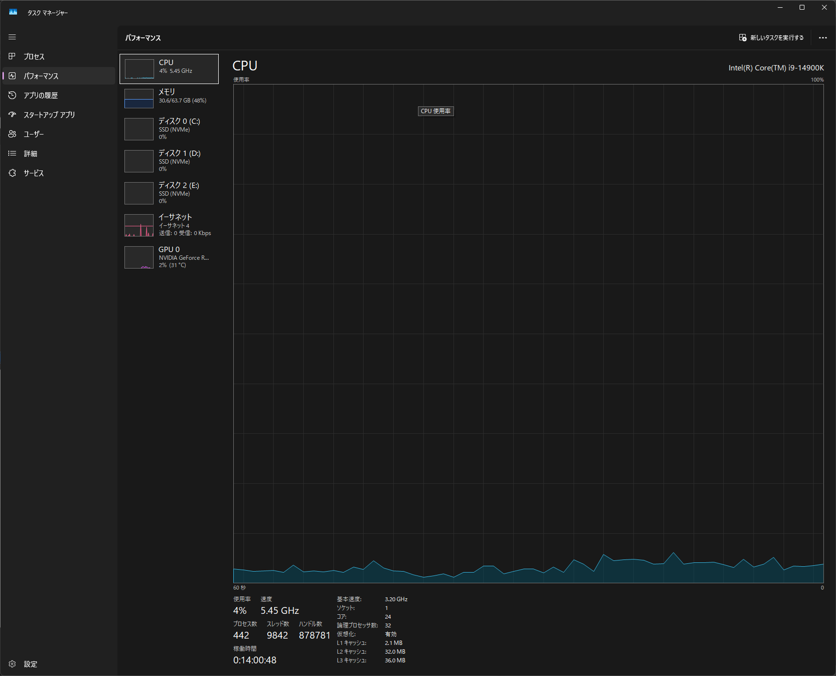 使用率が編集中に90%以上に張り付く場合はCPUがボトルネック。左ペインにCPUモデル名(上の例ではCore i9-14900K)と論理コア数が表示されるので、現在のスペックも確認できる。