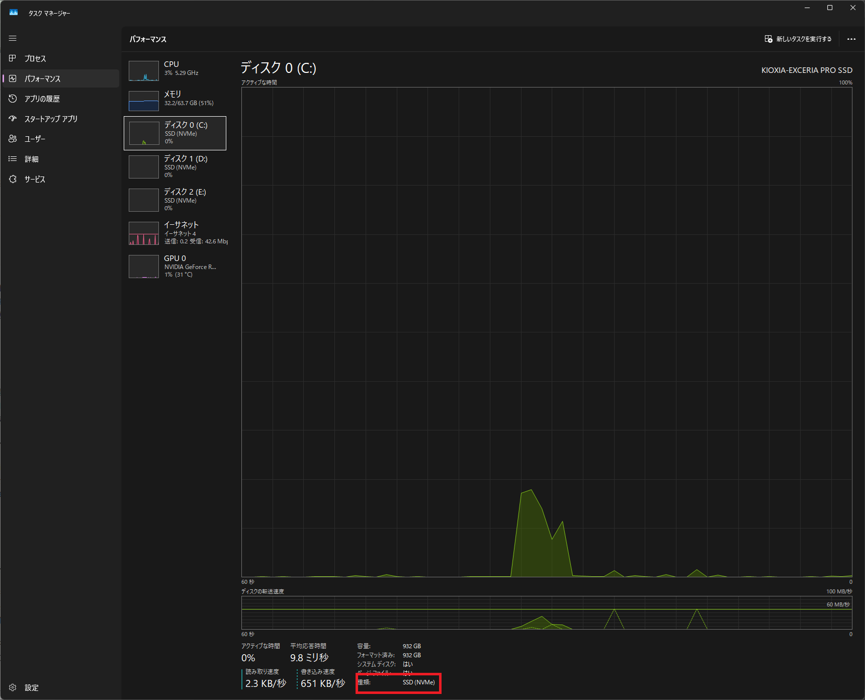 左ペインのディスク項目に「SSD (NVMe)」と表示されていればNVMe環境だ。「ハードディスクドライブ」と表示されている場合はHDDであり、動画編集のボトルネックになりやすい。アクティブな時間が編集中に常時高い場合も、ストレージがボトルネックになっているサインだ。
