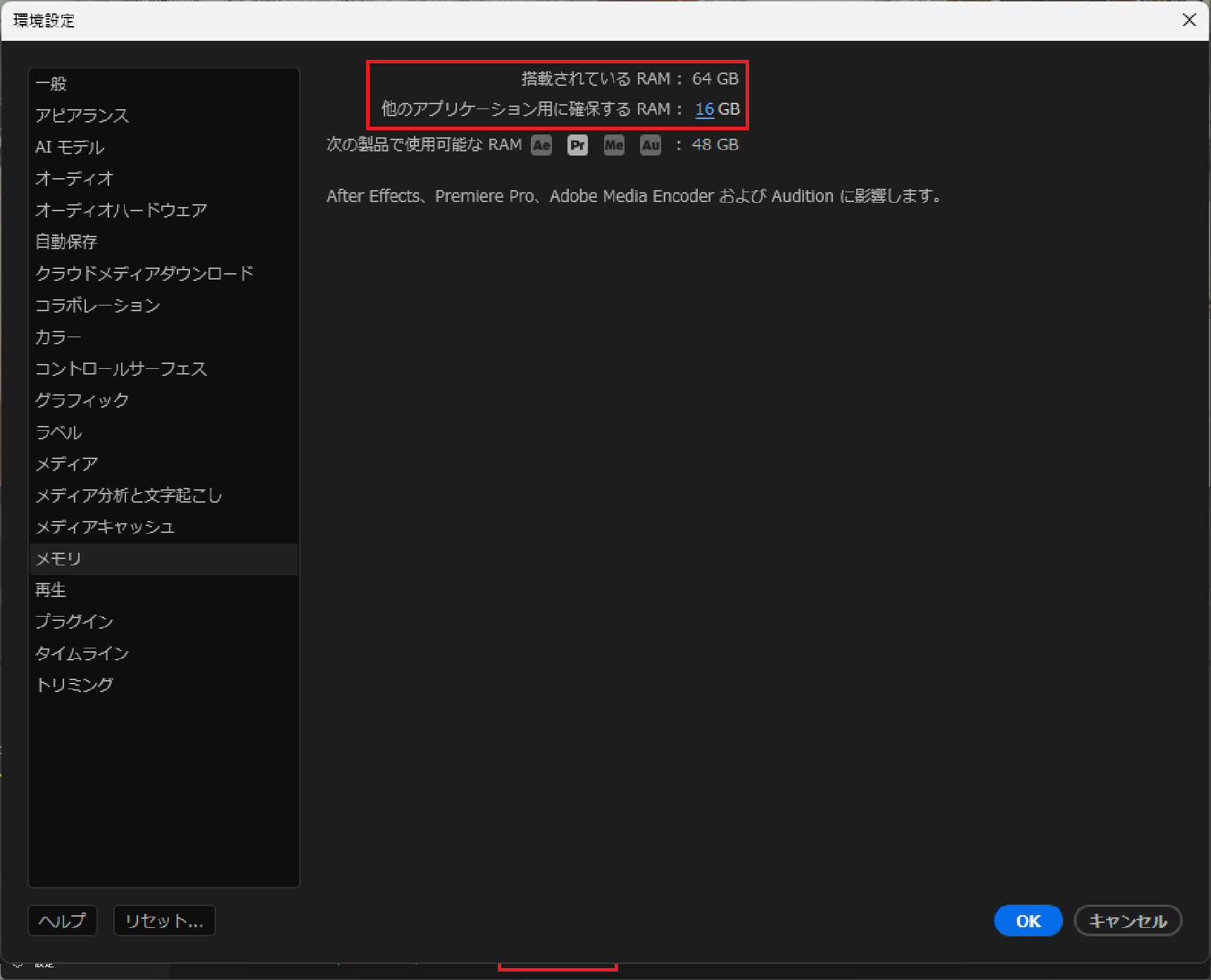 Premiere Proへのメモリ割り当て調整