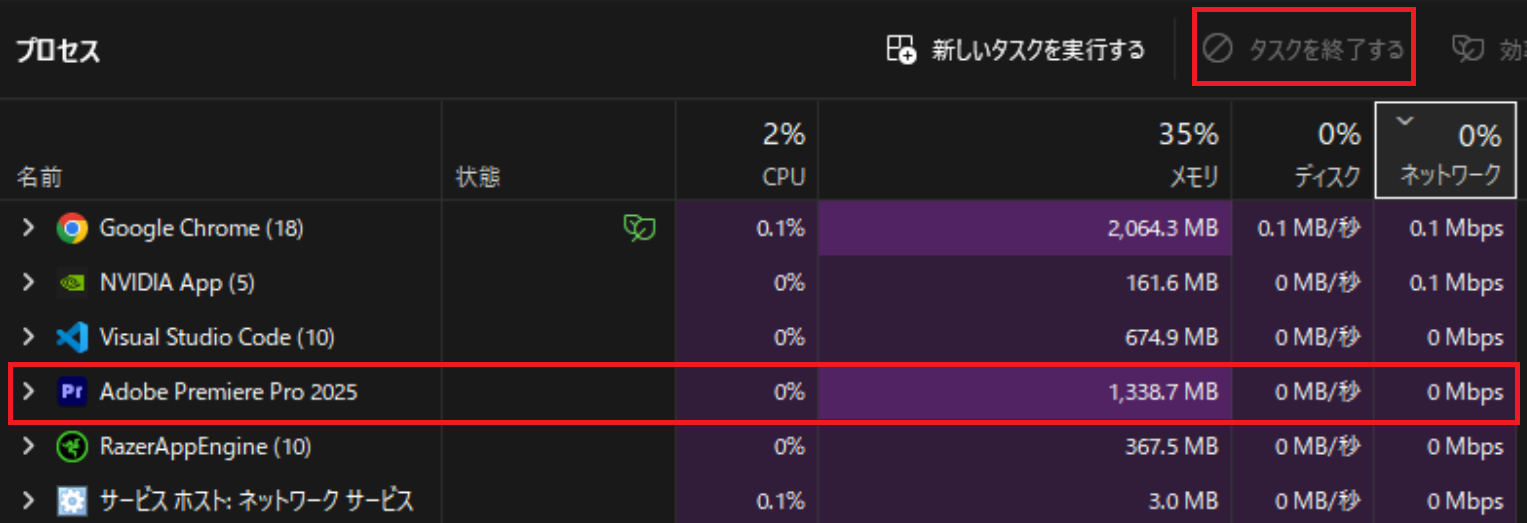 Ctrl+Shift+Escでタスクマネージャーを起動し、「プロセス」タブでPremiere Proの状態を確認する。「応答なし」と表示されている場合はプロセスを選択し、右上の「タスクを終了する」ボタンをクリックして強制終了する。プロセスを右クリック→「タスクの終了」でも同じ操作ができる。