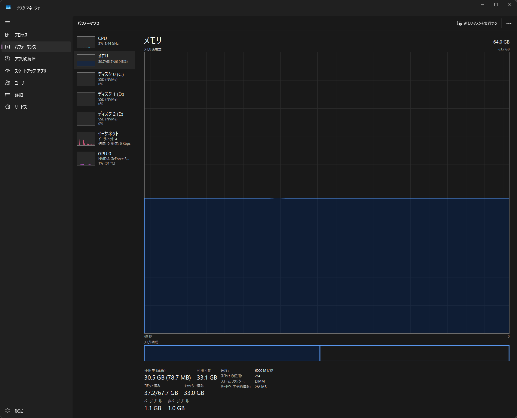 → RAM増設の効果が最も高いパターン。32GBに増設するだけで安定感が大きく変わる。タスクマネージャーのメモリグラフが常に上限付近に張り付いている状態がこれに該当する。